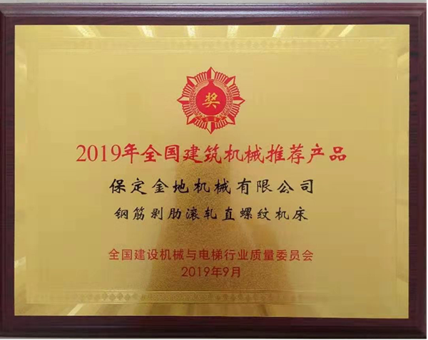25日晚上全國建設(shè)機械與電梯行業(yè)質(zhì)量委員會在無錫太湖國際博覽中心旁君來世尊酒店舉辦了“2019年建機推薦頒獎典禮暨中外客商迎賓晚宴”。我公司的主營產(chǎn)品鋼筋剝肋滾軋直螺紋機床喜提“2019年全國建筑機械推薦產(chǎn)品”,“金地”品牌又一次用高品質(zhì)產(chǎn)品獲得大家的認可!